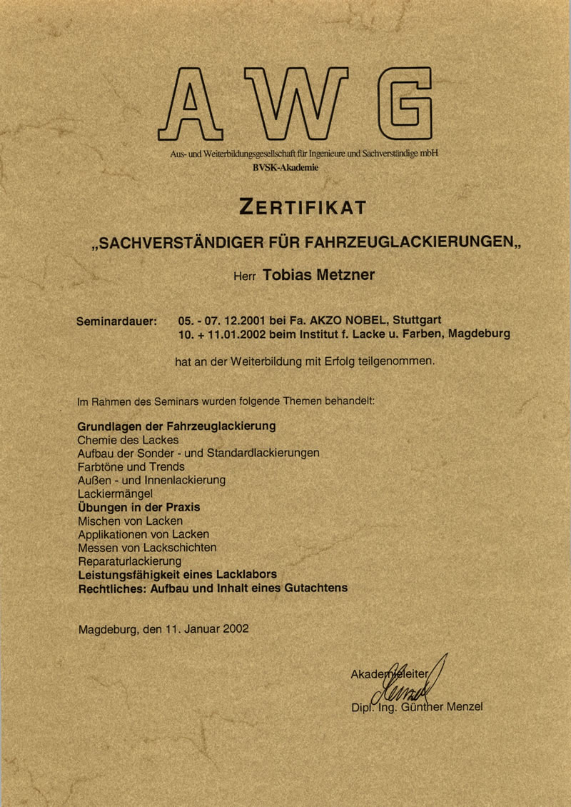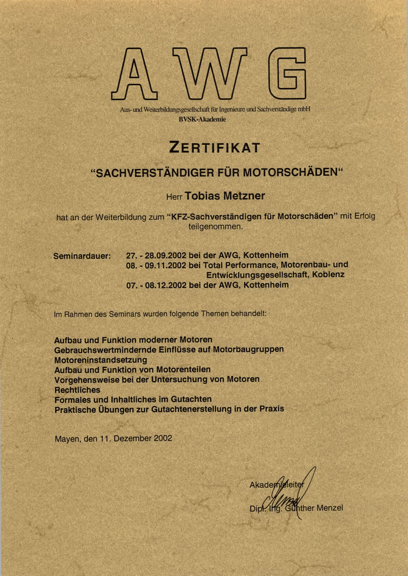 - Von der IHK-Frankfurt am Main öffentlich bestellt und vereidigt für Kraftfahrzeugschäden und -bewertung